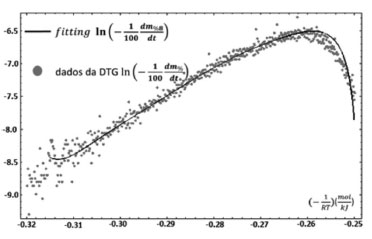 ![]() Figura 8. Curva de Arrhenius (ordem zero) a partir dos dados da DTG e do "fitting" polinomial