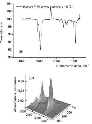 O óleo estudado apresentou uma taxa de absorção progressiva com o aumento da temperatura de queima até cerca de 200 ºC, conforme pode ser observado na Figura 11, em 3-D, e, esta foi atribuída como resultante de sua volatilização ou decomposição, em acordo com a literatura.13 Para Craveiro et al.13 os compostos monoterpênicos (cujo percentual na mistura corresponde a cerca de 9%, em peso) têm significativa absorbância nas regiões de 3.000 cm-1, 2.800 a 1.650 cm-1, entre 1.000 e 950 cm-1 e entre 900 e 850 cm-1, corroborando com os dados do espectro apresentado na Figura 11.