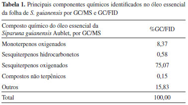 Caracterização química por GC/MS e GC/FID Na Tabela 1, estão listados os componentes químicos gerais, em porcentagem em massa, obtidos pela análise cromatográfica GC/MS do óleo essencial da folha da S. guianensis. Destacaram-se os sesquiterpenos oxigenados com 75,07% (em massa) e, destes, o β-mirceno, com 67,30%, seguidos pelos monoterpenos oxigenados em 8,37%, em massa, representado, basicamente, pelo 2-undecadona. O restante, em percentual em massa (15,83%), não foi identificado quanto à sua constituição química.