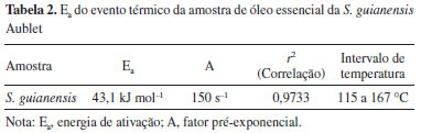 Esta, define o gráfico de Arrhenius, cujas variáveis Assim, este trabalho foi conduzido no sentido de investigar as propriedades térmicas do óleo essencial da S. guianensis usando TG/DSC. Os dados foram obtidos para calcular a Ea e o fator que modelam a cinética do evento térmico a partir da equação de Arrhenius. Também, no intuito de obter informações a respeito da estrutura química do óleo essencial trabalhado, a amostra foi adicionalmente analisada por meio da espectroscopia no infravermelho com transformada de Fourier (FTIR) acoplado ao equipamento.
