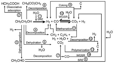 ![]() Figure 1. Probable reaction mechanisms occurring during ethanol reforming5