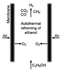 NEW TECHNOLOGIES Currently, newer systems for ethanol reforming are being investigated as promising options for H2 production. These are projected as completely new alternative technologies or as a complement for existing systems, such as reforming with steam or oxygen. Electrochemical ethanol reforming is a new technology that is performed in electrolytic cells with proton-exchange membranes. In addition, new reaction systems that include the use of membranes and plasma in the reactors have been implemented. Recently, membranes have been suggested to improve the separation processes.67 Park et al.68 developed a system of oxygen transport membranes called BSCF/Ag (Ba0.5Sr0.5Cu0.2Fe0.8O3-d/Ag) after their constituents. Such membranes supply the oxygen necessary to react with ethanol and produce H2 by autothermal reforming. The optimal conditions with a Rh-based catalyst is determined to be at 600 ºC. One of the most important feature of this system is the supply of high-purity oxygen, which increases ethanol conversion, and reduces coke formation (by increasing the yield of the catalyst). In this study, a conversion of 62% is obtained. However, a large amount of water is produced during the reaction, as part of the H2 produced is consumed by O2. The principal products are hydrogen, water, and acetaldehyde, which suggests that the dehydrogenation of ethanol is the dominant pathway. The functioning of this type of system is illustrated in Figure 2 and shows the entry of air and ethanol towards the membrane (where the reaction occurs) as well as the exit of the reaction products.