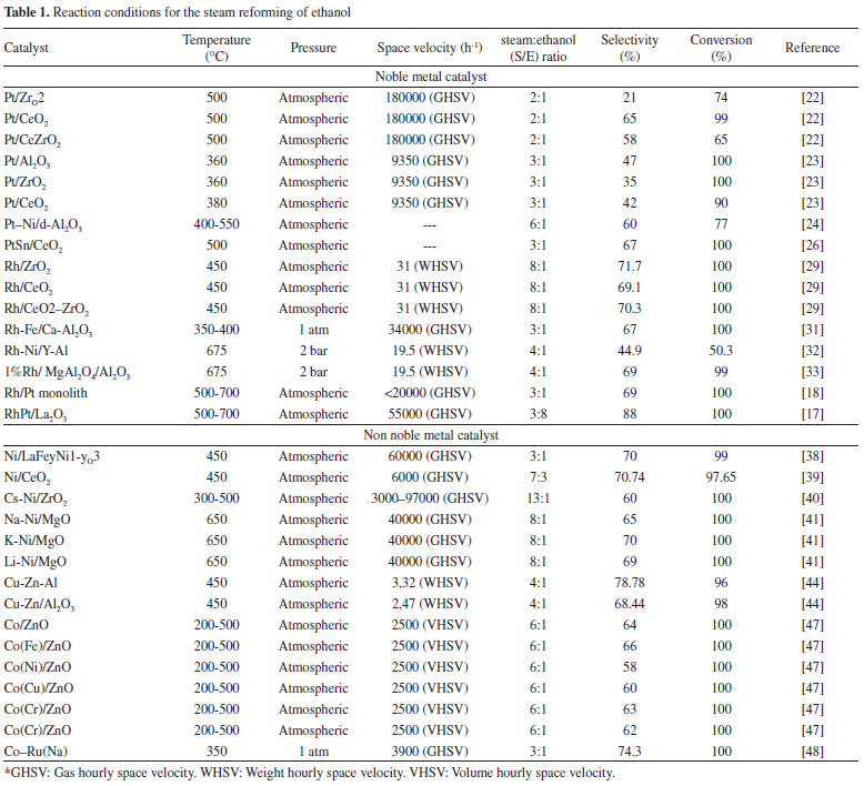 Department of Chemical Engineering, School of Engineering, Universidad de La Sabana, Campus Universitario Puente del común Km 7, Autopista Norte, Bogotá, Colombia Recebido em 13/06/2013 *e-mail: martha.cobo@unisabana.edu.co Catalytic steam reforming of ethanol (SRE) is a promising route for the production of renewable hydrogen (H2). This article reviews the influence of doping supported-catalysts used in SRE on the conversion of ethanol, selectivity for H2, and stability during long reaction periods. In addition, promising new technologies such as membrane reactors and electrochemical reforming for performing SRE are presented. INTRODUCTION Atmospheric pollution and degradation of the air are topics investigated widely because of their direct impact on the quality of life of the population. Significant contribution of fossil fuels to environmental degradation in energy generation processes and the depletion of petroleum reserves make it necessary to find alternative energy sources, which are renewable, sustainable, cost-effective, and safe, to replace the current sources of energy. Hydrogen (H2) has been identified as a suitable fuel for sustainable energy production. It can be used in fuel cells to generate electricity at high efficiency, in addition to producing water as the only byproduct. Demand for H2 from fuel cells will increase considerably in the coming years; however, it is currently produced from a fossil fuel (natural gas).1 Therefore, it is desirable to incorporate renewable sources for its generation to allow for the development of a sustainable H2 economy.2 Reforming alcohols for H2 production has generated great interest because this technique is based on renewable sources, such as bioethanol, which is currently a widely produced and distributed biofuel. One of the most promising methods for H2 production from ethanol is the catalytic steam reforming of ethanol (SRE). The selection and development of a suitable catalyst for SRE is a key aspect, as the catalyst must be stable, active, selective, and maximize hydrogen production while simultanously disfavoring the formation of byproducts (CO and CH4). Various catalysts for SRE including metal oxides, and transition and noble metals supported on oxides (with a wide range of redox and acid-base properties) have been studied. The nature of the metal, type of precursor (or dopant), method of preparation, type of support, additives, and operating conditions have been found to exert a great influence on SRE.3 In addition, the regeneration and reuse of the catalysts are features that must be considered for a more efficient application.4 Various review articles on the design of the catalyst for the SRE have been published.2,5-7 In these articles, the selection of active metals and catalyst support has been analyzed as the critical factor that allows for obtaining catalysts with high activity and selectivity. In contrast to previous review articles, this study compares the systems that report greater ethanol conversion rates and selectivity toward hydrogen, while placing emphasis on the stability of catalysts for periods exceeding 50 h of operation. In addition, the presence or absence of any precursors and their effect on catalytic behavior has been evaluated. The state of progress of the new catalytic systems proposed for hydrogen production based on ethanol reforming, such as monoliths, microreactors, and membrane reactors, is also analyzed. Although they are interesting proposals, all new catalytic system exhibit lower efficiencies than those of the traditional technologies.
