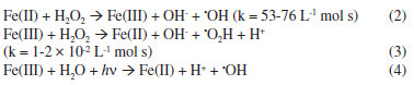 De La Cruz et al.74 comprovaram o aumento na eficácia da degradação de 32 poluentes detectados em um efluente de ETE (inclusive três fluoroquinolonas) quando empregado o processo UV/H2O2 ao invés da radiação UV254nm isoladamente. Após 10 min de irradiação, 36% da norfloxacina, 65% da ofloxacina e 48% da ciprofloxacina foram degradadas pelo processo fotolítico. Adicionando 50 mg L-1 de H2O2 e aplicando essa mesma dose de radiação (UV/H2O2), observaram que 100% da concentração das fluoroquinolonas ofloxacina e norfloxacina presentes no efluente foi degradada após 10 min de reação. Porém, para a ciprofloxacina, a total degradação foi observada apenas após 30 min de reação. Rivas et al.82 verificaram que o processo UV/H2O2 foi eficaz na degradação da norfloxacina presente em solução aquosa; no entanto, a radiação UV isoladamente não foi capaz de degradar esse fármaco. Kim et al.94 aplicaram a fotólise para o tratamento de uma solução contendo resíduos de 39 fármacos. Para a remoção desses compostos da solução aquosa, foi necessária uma dose de radiação UV de 2,77 J cm-2, a qual pode ser considerada alta quando comparada aos 0,04-0,14 J cm-2 necessários para promover a desinfecção. Porém, com a adição de H2O2, houve um aumento significativo na porcentagem de remoção dos contaminantes, com o emprego de uma menor dose de radiação UV (0,92 J cm-2). O mesmo foi constatado por Da Silva et al.78 durante a avaliação da degradação de 0,5 mg L-1 de flumequina por UV/H2O2. Neste estudo, reduzindo a dose de radiação UV pela metade (de 5,68 para 2,84 J cm-2), na presença de 1,0 mmol L-1 de H2O2, resultados similares foram obtidos com relação à degradação da flumequina (aproximadamente 98%). Além disso, a atividade antimicrobiana da solução submetida ao processo UV/H2O2 por 15 min foi semelhante à obtida quando empregado 5,68 J cm-2 (60 min) de radiação UV isoladamente. Fenton e foto-Fenton O POA reagente de Fenton produz radicais •OH como resultado da clivagem de peróxido de hidrogênio catalisado por Fe(II), que por sua vez é oxidado a Fe(III), como apresentado na Equação 2.118,119 A taxa de reação diminui durante o processo devido ao consumo dos reagentes (Fe(II) e H2O2) e da redução extremamente lenta do Fe(III) para Fe(II), conforme apresentado na Equação 3.118 Quando o processo Fenton é conduzido sob radiação UV (processo foto-Fenton), ocorre a foto-redução do Fe(III) para Fe(II). Esta regeneração do Fe(II) gera, subsequentemente, mais radicais hidroxila no meio aquoso, conforme apresentado na Equação 4.118