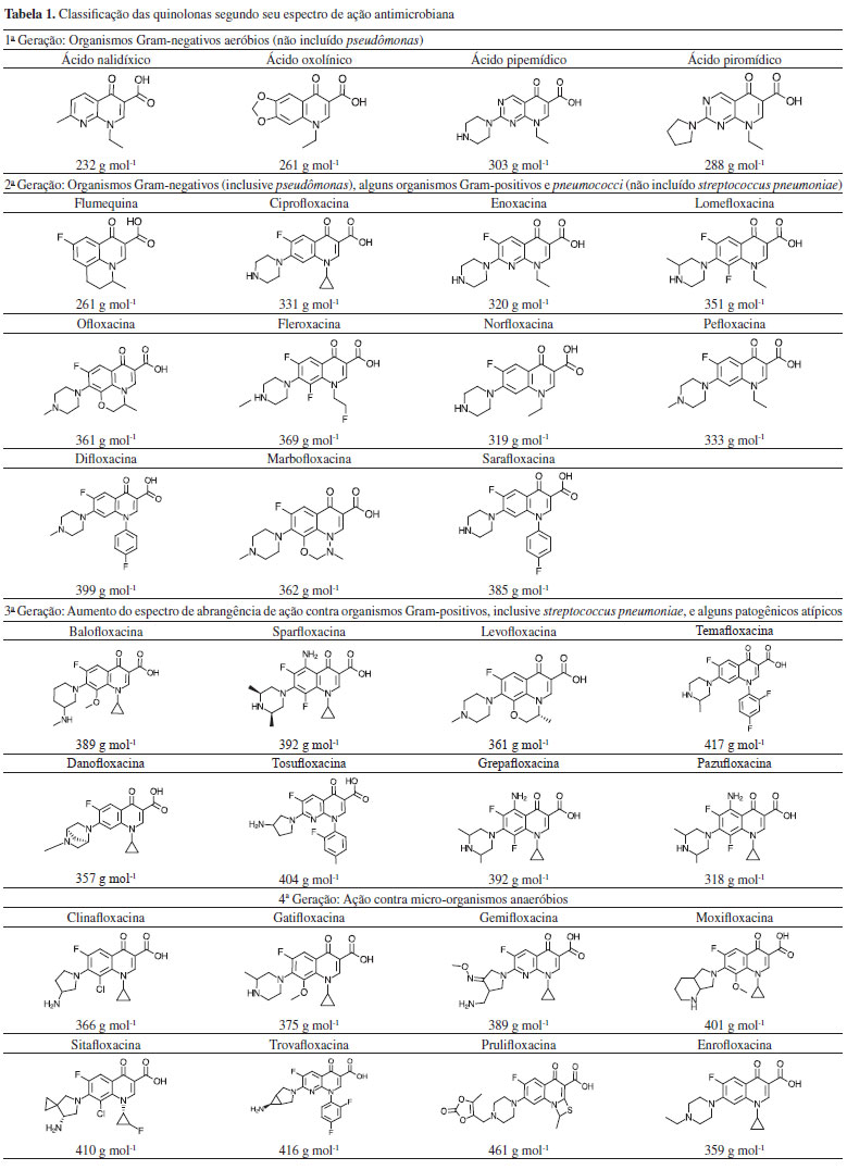 Uma das principais mudanças na estrutura das quinolonas foi a adição de um átomo de flúor na posição C-6, que ampliou o espectro de ação das quinolonas para as bactérias Gram-positivas. A adição de um segundo átomo de flúor na posição C-8 resultou no aumento da absorção e aumento da meia-vida da quinolona no organismo humano; no entanto, aumentou a fototoxicidade do composto. A adição de um grupo piperazina na posição C-7 ampliou a ação contra as bactérias aeróbias Gram-negativas. Com a adição de um grupo metila ao nitrogênio da piperazina, observou-se um aumento do tempo de meia-vida no organismo e da biodisponibilidade. Um aumento da ação contra bactérias aeróbias patogênicas Gram-negativas e Gram-positivas foi observado com a adição de um grupo ciclopropil na posição N-1.4 Não é totalmente claro na literatura como as quinolonas são classificadas com relação às gerações, uma vez que cada autor emprega um método diferente. A única divisão aceita universalmente é a separação entre compostos com flúor (também denominadas como fluoroquinolonas) das quinolonas de primeira geração, que não possuem flúor em sua composição. King et al.,7 Ball,8 Xiao et al.,9 e Bolon5 relacionaram as quinolonas com o seu espectro de abrangência contra micro-organismos patogênicos, classificando esses antimicrobianos em quatro gerações diferentes, apresentadas na Tabela 1.