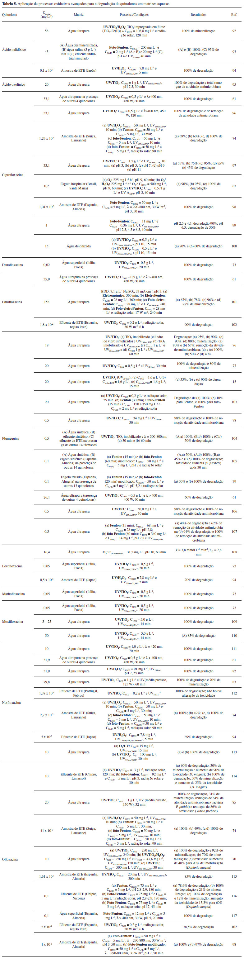 Processos oxidativos avançados Os POA podem ser definidos como processos baseados na formação do radical hidroxila (•OH), um forte oxidante não seletivo com capacidade de mineralizar compostos orgânicos, devido ao seu elevado potencial de redução (E = 2,73 V), superior ao dos oxidantes convencionais.87,88 Os radicais hidroxila se destacam frente a outros oxidantes visto a sua capacidade de inativar micro-organismos e,89 principalmente, de mineralizar compostos orgânicos recalcitrantes90,91 como, por exemplo, antimicrobianos presentes em matrizes aquosas.16 O uso da radiação solar e de lâmpadas de que emitem radiação ultravioleta tem se mostrado indicado para a degradação de quinolonas em solução aquosa quando o emprego se dá em conjunto com H2O2, O3, Fe(II) e TiO2,13,61,67,70,73,74,76-79,82,83,85,92-117 conforme apresentado na Tabela 5.