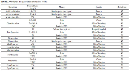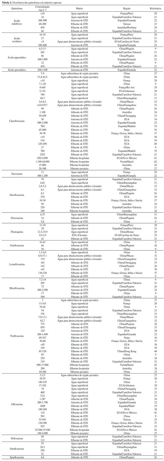 Não existem dados e informações disponíveis na literatura sobre o volume de produção de medicamentos, inclusive antimicrobianos, voltados à medicina humana e veterinária no Brasil e pouco se conhece sobre o destino e efeitos desses compostos no meio ambiente. No Brasil, sabe-se apenas que a produção de medicamentos destinados à medicina humana e veterinária movimentou cerca de R$ 22,1 bilhões em 2010, sendo R$ 1,3 bilhão referente à produção e venda de antimicrobianos destinados ao consumo humano e R$ 1,5 bilhão ao uso veterinário.18 Nos Estados Unidos da América, o Animal Health Institute (AHI) apresentou uma estimativa que em 2008, dos 12 milhões de quilos de antimicrobianos produzidos, apenas 30% seria empregado para fins terapêuticos.19 Pesquisas sobre o monitoramento de quinolonas em águas superficiais são escassas na literatura especializada. Dos trabalhos publicados sobre a ocorrência e identificação de tais compostos no ambiente, apenas algumas das quinolonas existentes, apresentadas na Tabela 1, são foco dos estudos, conforme apresentado nas Tabelas 2 e 3. As principais pesquisas sobre a ocorrência de quinolonas em matrizes aquosas (água superficial, água para abastecimento público, afluente e efluente de estações de tratamento de esgoto, efluente hospitalar e efluente pecuário) foram realizadas na Europa (França, Espanha, Áustria, Holanda, Suíça, Grécia, Itália e Suécia), Ásia (China, Vietnã e Taiwan) e Estados Unidos. A concentração das quinolonas variou entre ng L-1 e µg L-1 em matrizes aquosas (Tabela 2)9,20-44 e, em solo, variou entre ng g-1 a µg g-1 (Tabela 3).26,28,45-47
