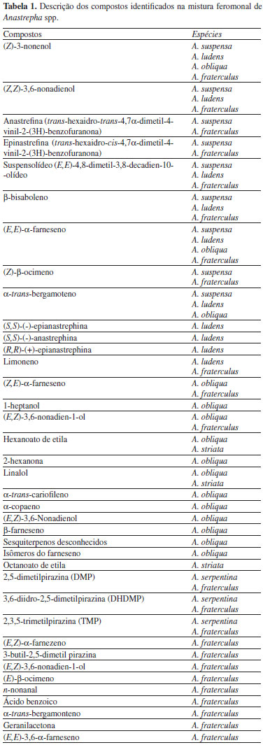 Anastrepha suspensa Para A. suspensa, nove compostos incluindo dois álcoois: (Z)-3-nonenol e (Z,Z)-3,6-nonadienol;62 três lactonas isoméricas: anastrefina (trans-hexaidro-trans-4,7α-dimetil-4-vinil-2-(3H)-benzofuranona), epianastrefina (trans-hexaidro-cis-4,7α-dimetil-4-vinil-2-(3H)-benzofuranona) e suspensolídeo (E,E)-4,8-dimetil-3,8-decadien-10-olídeo);63,64 três sesquiterpenos: β-bisaboleno, E,E-α-farneseno e α-trans-bergamoteno e um monoterpeno: (Z)-β-ocimeno,65-67 foram identificados como os compostos voláteis presentes na mistura liberada por machos e que funciona como atraente para as fêmeas. As fontes de emissão destes compostos são principalmente a boca e a bolsa anal do macho, entretanto, a liberação de alguns destes constituintes voláteis através de poros presentes na cutícula não pode ser descartada.40,42 Existem dois aspectos interessantes no comportamento de sinalização sexual de machos de A. suspensa: o primeiro é que, durante a liberação de feromônios, os machos tocam a face da folha com um material proveniente da glândula anal e segundo, eles regurgitam, através da boca, gotas de líquido sobre as superfícies foliares. Existe um pico de inclinação da glândula feromonal anal no começo do fotoperíodo, seguido por um declínio e, então, mais um período extensivo de atividade na segunda metade do fotoperíodo. Durante os períodos de picos de sinalização, a maioria dos machos tem uma série distinta de glândulas laterais projetadas para frente na maior parte do tempo. Episódios de agitação de asas (os quais podem dispersar o feromônio) também são observados e a inclinação de abdômen coincide com o período de ocupação do macho na superfície da folha. Por sua vez, as fêmeas são atraídas até 48 horas após a deposição e, além disso, esse comportamento também foi observado em machos no momento em que estão formando as assembleias ou leks, objetivando criar um sistema em que a volatilização do feromônio é lenta.68 Inicialmente, foi sugerido que as lactonas isoméricas anastrefina e epianastrefina poderiam funcionar como odores de atração, para fêmeas desta espécie, quando misturados à secreção oral.51 Posteriormente, análises químicas de extratos da secreção oral de machos sexualmente maduros revelaram que além das duas lactonas acima mencionadas existem mais três compostos: outra lactona, o suspensolídeo e dois sesquiterpenos: β-bisaboleno e (E,E)-α-farneseno, os quais também estão presentes, em grandes quantidades, na mistura de compostos liberada por machos de A. suspensa durante a sinalização sexual.69 Anastrepha ludens A mistura feromonal produzida ou emitida por machos de A. ludens é quimicamente muito semelhante àquela produzida por machos de A. suspensa.67 Os estudos conduzidos até hoje reportaram que as duas espécies diferiram marcadamente com relação à mistura de terpenos liberada, em particular quanto às proporções relativas dos sesquiterpenos. A mistura de compostos liberada por machos de A. suspensa continha o sesquiterpeno cíclico β-bisaboleno, como o componente mais abundante, uma menor quantidade de (E,E)-α-farneseno e traços de α-trans-bergamoteno. Por outro lado, a mistura de compostos voláteis liberados por machos de A. ludens apresentava o sesquiterpeno acíclico (E,E)-α-farneseno, como o componente presente em maior proporção, uma menor quantidade de α-trans-bergamoteno e uma quantidade mínima de β-bisaboleno. Essas duas espécies também diferiram com relação aos monoterpenos presentes na mistura de compostos voláteis liberada pelos machos. A. suspensa liberou exclusivamente o monoterpeno acíclico (Z)-β-ocimeno, enquanto A. ludens emitiu somente o isômero cíclico deste, o limoneno. Os autores relacionaram as diferenças encontradas nos terpenos de A. suspensa e A. ludens ao isolamento reprodutivo destas duas espécies.67 Sendo assim, as diferenças quantitativas e qualitativas da composição feromonal garantem a especificidade da comunicação química entre as duas espécies. Anastrepha obliqua Em A. obliqua, os primeiros estudos relatando a composição do feromônio sexual de machos foram realizados há dez anos. No primeiro estudo com esta espécie, dois compostos, (Z,E)-α-farneseno e (E,E)-α-farneseno, foram identificados como os compostos voláteis majoritários presentes na mistura liberada por machos. Além destes terpenóides, o álcool (Z)-3-nonenol foi também identificado, sendo que os dois primeiros foram isolados de extratos das glândulas salivares e o último do intestino posterior de machos desta espécie. Além disso, outros compostos, tais como: (Z,Z)-3,6-nonadienol, β-bisaboleno, suspensolídeo, anastrefina e apianastrefina, que foram identificados como componentes da mistura de compostos liberados por machos de A. suspensa e A. ludens, não foram detectados na mistura produzida por machos de A. obliqua.70,71 Em um segundo estudo, conduzido em 2004,72 foi demonstrado que a mistura de compostos liberada por machos desta espécie é caracterizada pela presença predominante do 1-heptanol. Esse álcool não havia sido identificado em nenhuma das espécies do gênero Anastrepha estudadas até então. Entretanto, nenhuma das lactonas identificadas na mistura feromonal de machos de A. suspensa e A. ludens foi detectada na mistura de compostos voláteis liberada por machos de A. obliqua. Por outro lado, compostos oxigenados, tais como: (E,Z)-3,6-nonadien-1-ol, 2-hexanona, hexanoato de etila e os terpenóides: linalol, α-trans-bergamoteno, α-trans-cariofileno e α-copaeno foram caracterizados como constituintes da mistura de compostos liberada por machos de A. obliqua. Recentemente, foram identificados nove compostos liberados por machos desta espécie, pertencentes a populações de laboratório, a saber: (Z)-3-nonenol, nonadienol, um sesquiterpeno de identidade desconhecida, β-farneseno, (E,E)-α-farneseno, (Z,E)-α-farnese