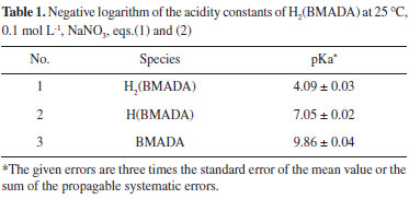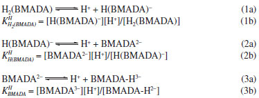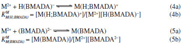 The collection of the experimental data associated with the potentiometric pH titrations can be completed by considering the abovementioned equilibria (1)-(5) if the titrations are not performed in the pH range, where the formation of a hydroxo complex occurs. Potentiometric analyses The results of all potentiometric pH titrations, i.e., the acidity and stability constants, are summarized in Tables 1 and 2. The deprotonated BMADA2- can accept two protons to afford the acid H2(BMADA). When the first proton of these two protons, which is associated with a carboxylate residue, is released, its pKa is ca. 4. However, BMADA- can also release an additional proton at ca. pH 7. The third proton is released from the amino group at ca. pH = 9.86, which is in agreement with similar derivatives of EDDA.11 The first acid dissociation constants determined in this study are in good agreement with the values reported by other authors for related amino acids.11,13,14 However, the carboxyl group is a far stronger acid than the residue group.15 The stability constants of the binary complexes of M-BMADA were refined separately using the titration data of this system in a 1:1 ligand:M2+ ratio under the same conditions of temperature and ionic strength (according to equilibria 4 and 5) because they were not in agreement with the reported values for related amino acids;11,14 however, we did not achieve reasonable results for