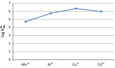 ![]() Figure 2. Irving-Williams sequence-type plot for the 1:1 complexes of Mn2+ and Cd2+ with BMADA (see Table 2)