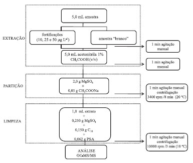 Preparou-se individualmente 10 mL de solução estoque aproximadamente 1000 mg L-1 de cada agrotóxico em MeCN considerando a pureza dos padrões sólidos e as soluções estoque foram armazenadas em frascos âmbar a -18 ºC. Após, foram preparadas soluções analíticas individuais dos compostos em estudo na concentração de 100,0 mg L-1, em MeCN. A partir destas soluções preparou-se uma mistura na concentração 10,0 mg L-1, em MeCN, contendo todos os compostos e por diluição, preparou-se uma mistura na concentração 1,0 mg L-1. O padrão de substituição e os padrões internos, foram preparados separadamente na concentração de 10,0 mg L-1. Neste trabalho, a fim de minimizar as fontes de erros durante o preparo das amostras, o padrão de substituição modificado isotopicamente (trifluralina-d14) foi adicionado em todas as amostras na concentração de 50 µg L-1 antes do procedimento de extração, para detectar possíveis erros durante esta etapa. Instrumentação Sistema GC-MS/MS triploquadrupolo (Varian, EUA) equipado com cromatógrafo a gás CP 3800; amostrador automático CP 8400; injetor 1079 (PTV, programmable temperature vaporizer), com insersor de vidro silanizado, d.i. de 3,4 mm, contendo cerca de 0,5 cm de CarboFrit®; coluna capilar CP VF-5-MS (5% fenil 95% dimetilpolisiloxano), 30 m de comprimento, 0,25 mm de d.i. e 0,25 µm de espessura de filme; detector MS triploquadrupolo 1200, atuando no modo de monitoramento de reações selecionadas e sistema de aquisição de dados através do software MS Workstation 6.4. Centrífuga refrigerada NT 825 (Nova Técnica, Brasil); centrífuga refrigerada SL 703 (SOLAB, Brasil); purificador de água Milli-Q Direct 3UV (Millipore, França) e agitador vórtex QL-901 (Biomixer, Brasil). Procedimento experimental O procedimento de extração utilizado neste estudo consistiu de 5 mL de amostra em tubos de 50 mL, extraída com 5 mL de MeCN acidificada com 1% (v/v) de CH3COOH, seguida de agitação manual vigorosa por 1 min. Para a etapa de partição foram adicionados 2,0 g de MgSO4 e 0,85 g de CH3COONa, seguida de agitação manual por 1 min e posterior centrifugação a 3400 rpm por 8 min à 20 ºC. Para a otimização do procedimento de extração e limpeza utilizou-se uma amostra de leite, isenta de agrotóxicos, e fortificada apenas no nível de 50,0 µg L-1. Após a definição do melhor procedimento de extração, os ensaios foram realizados nos três níveis de validação propostos, sendo as extrações iniciadas 30 min após a fortificação. Testes preliminares de limpeza foram efetuados com diferentes combinações de sorventes, visando uma melhor eficiência na etapa de limpeza empregando a técnica de D-SPE. Estipulou-se como parâmetro ideal percentuais de recuperação entre 70 e 120% e valores de RSD < 20%.36 Os testes da etapa da limpeza dispersiva consistiram em diferentes combinações de MgSO4, C18, PSA e precipitação a baixa temperatura, seguidas de agitação e posterior centrifugação em tubos eppendorf de 2 mL a 10000 rpm por 3 min à temperatura de 10 ºC. As seguintes possibilidades foram avaliadas: teste 1) 1 mL de extrato + 150 mg MgSO4 + 125 mg C18; teste 2) 1 mL de extrato + 150 mg MgSO4 + 125 mg C18 + 62 mg de PSA; teste 3) 1 mL de extrato + 150 mg MgSO4 + 125 mg C18 + 62 mg de PSA + PBT e teste 4) 1 mL de extrato + 150 mg MgSO4 + 125 mg C18 + PBT. Validação A validação é o processo realizado para verificar se o método utilizado é adequado para a finalidade pretendida.36 O método QuEChERS modificado foi validado avaliando-se os seguintes parâmetros: linearidade através da curva analítica, limite de detecção (LOD), limite de quantificação (LOQ), exatidão (recuperação), precisão (repetibilidade e precisão intermediária) e efeito matriz. Empregando o método dos mínimos quadrados obteve-se a regressão linear para avaliar a linearidade das curvas analíticas, as quais foram preparadas no solvente (MeCN) e no extrato branco de leite UHT integral. Para cada analito a faixa de concentração avaliada foi de 1 a 200 µg L-1. A partir da avaliação dos dados de linearidade das curvas analíticas, procedeu-se à determinação da estimativa do LOD e LOQ. O LOQ do instrumento (LOQi) para cada analito foi estimado a partir da relação sinal/ruído calculada pelo software do equipamento, considerando no mínimo dez vezes a razão do sinal pela linha de base (ruído). O LOQ do método (LOQm) foi obtido através dos ensaios de fortificação, no qual o menor nível de fortificação com recuperação na faixa de 70 a 120% foi selecionado como o LOQ do método. Para avaliar a veracidade do método, foram utilizados ensaios de fortificação, avaliando-se, dessa maneira, a recuperação dos compostos em estudo. Foram realizadas seis fortificações das amostras "branco" em três níveis diferentes de concentração (10,0; 25,0 e 50,0 µg L-1), totalizando 18 análises. Os níveis de fortificação foram escolhidos levando em consideração os limites máximos de resíduos (LMR) estabelecidos pela legislação nacional.37 A precisão do método, em termos de repetibilidade e da precisão intermediária, foi avaliada em função do desvio padrão relativo (RSD) dos resultados de recuperação. As agências que regulamentam a validação de métodos cromatográficos visando à análise de resíduos de agrotóxicos em alimentos indicam que os intervalos de recuperação aceitáveis devem estar na faixa entre 70 e 120%, com precisão de até ± 20%.36 Durante as análises cromatográficas os componentes da matriz contidos nos extratos podem influenciar na quantificação dos analitos, gerando resultados duvidosos. Esse fenômeno é denominado efeito matriz.38 O efeito matriz pode ser observado pela significante diferença de resposta obtida em padrões preparados no solvente daqueles preparados no extrato da matriz. Para compensar este efeito emprega-se, geralmente, a quantificação frente a c