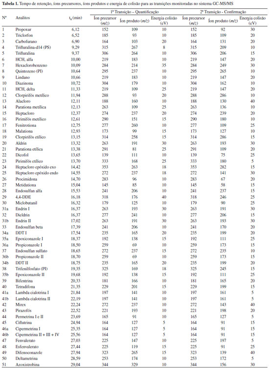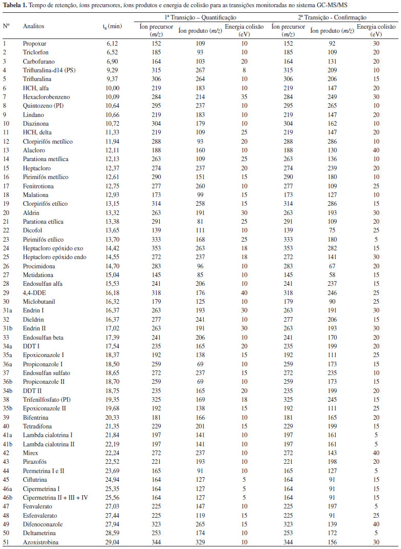 PARTE EXPERIMENTAL Materiais, reagentes e padrões Tubos de polipropileno com tampa de rosquear, capacidade de 15 e 50 mL; tubos eppendorf de 2 mL; frascos de vidro (vial) com capacidade de 2 mL; insert de vidro de 150 µL; filtro de nylon para seringa (13 mm, 0,2 µm); gelo seco; extran® neutro (Merck, Brasil). Acetonitrila (MeCN) grau HPLC; sulfato de magnésio anidro (MgSO4) (J. T. Baker); acetato de sódio anidro (CH3COONa); ácido acético glacial (CH3COOH) grau HPLC; sorventes amina primária secundária (PSA) 40 µm e octadecilsilano (C18) 40 µm (Agilent Technologies, EUA). Os 48 agrotóxicos analisados estão apresentados na Tabela 1. Como padrão interno (PI) foi utilizado quintozeno e trifenilfosfato e como padrão de substituição (PS) foi utilizado trifluralina-d14. Todos os padrões foram adquiridos da firma Dr. Ehrenstorfer (Alemanha).