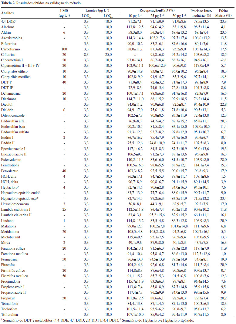 Validação do método Curva analítica, faixa de trabalho e efeito matriz Soluções preparadas em MeCN e no extrato "branco" da matriz, nas concentrações de 1,0; 2,0; 5,0; 10,0; 25,0; 50,0; 75,0; 100,0; 150,0 e 200,0 µg L-1 foram injetadas no sistema GC-MS/MS. As áreas dos picos foram integradas e um gráfico foi construído (área versus concentração). Os dados foram submetidos à regressão linear por método dos mínimos quadrados ordinários. A qualidade do ajuste linear foi verificada através do coeficiente de determinação. A partir dos resultados das equações das retas obtidas, pode-se concluir que o modelo linear é satisfatório segundo a literatura,43 pois todos os compostos apresentaram coeficientes de determinação (r2) maiores que 0,99. Este comportamento linear foi observado para todos os compostos entre o LOQ e 200 µg L-1. A intensidade do efeito matriz para dado agrotóxico é influenciada pela natureza da amostra e pelo tipo de coextrativos (tamanho das moléculas, polaridade, estabilidade térmica, volatilidade, etc.).44 Para a avaliação da existência de efeito matriz (EF), duas séries de soluções padrão foram preparadas, sendo uma no solvente puro (acetonitrila) e a outra no extrato da matriz. A contribuição do efeito matriz foi avaliada por comparação entre as inclinações das curvas obtidas empregando-se soluções analíticas em acetonitrila e aquelas obtidas com soluções analíticas preparadas no extrato "branco" da matriz, conforme a fórmula EF(%) = [(inclinação da curva na matriz - inclinação da curva no solvente)/inclinação da curva no solvente]×100.45 Observa-se na Tabela 2, que a maioria dos compostos analisados apresentaram efeito matriz. Pinho et al.44 explicam esta diferença de sinal analítico em função da disponibilidade dos sítios ativos do sistema cromatográfico. Quando padrões analíticos são preparados em solvente puro e analisados por GC, os sítios ativos do insersor estão disponíveis para a retenção dos analitos e, assim, menor quantidade é transferida para a coluna e, consequentemente, detectada. Na análise dos padrões analíticos preparados no extrato da matriz ocorre uma competição entre os componentes da matriz e os analitos pelos sítios ativos do insersor. Essa competição entre os compostos pelos sítios ativos possibilita que maior quantidade de agrotóxico seja transferida para a coluna cromatográfica. Assim, as curvas analíticas das soluções preparadas no extrato "branco" da matriz apresentam, em geral, um coeficiente angular maior quando comparadas com aquelas preparadas em solvente. Devido à constatação da ocorrência de efeito matriz, as soluções analíticas deste trabalho foram preparadas em extrato "branco" da matriz.