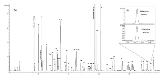 Figura 1. Representa em (a) cromatograma de íons totais da solução analítica 25 μg L-1 preparada no extrato "branco" da matriz contendo os 48 compostos avaliados neste estudo. Em (b) observa-se a alta especificidade do modo de aquisição SRM empregado no MS/MS, destacando os picos obtidos nas duas transições