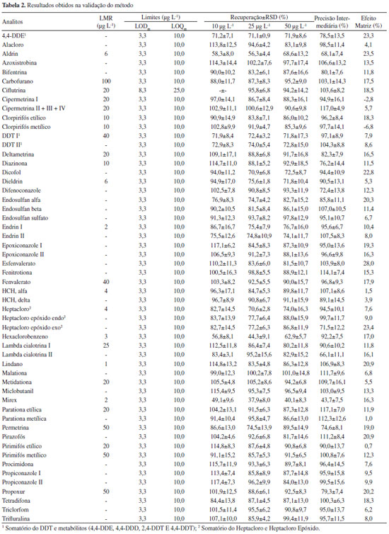 Limite de detecção e de quantificação do instrumento e do método Para um grande número de analitos os valores de LODi e LOQi variaram entre 0,3 e 1,5 µg L-1 e 1,0 e 5,0 µg L-1, respectivamente. O agrotóxico ciflutrina apresentou valores mais elevados de LODi (3,3 µg L-1) e LOQi (10,0 µg L-1). Os valores de LODm e LOQm foram avaliados em função dos resultados obtidos a partir dos ensaios da exatidão e precisão. O LOQm foi definido como o menor nível de fortificação que apresentou valores de recuperação entre 70 e 120% e RSDr < 20%.36 A partir dos resultados apresentados na Tabela 2 observa-se que a maioria dos compostos avaliados neste estudo apresentaram o nível de 10,0 µg L-1 como LOQm e 3,3 µg L-1 LODm. A ciflutrina apresentou valores mais elevados de LOQm (25,0 µg L-1) e LODm (8,3 µg L-1). Comparando os dados obtidos neste trabalho com os obtidos por Bastos et al.,46 11 compostos em comum foram analisados e apresentaram resultados semelhantes empregando também método QuEChERS acetato, mas com etapa de limpeza dispersiva utilizando MgSO4, PSA e alumina ao invés de C18, utilizado neste trabalho. Em relação aos LOQs obtidos, quando comparados ao trabalho proposto, apresentam valores menores, porém foram obtidos levando em consideração o sinal/ruído (S/R) do equipamento e não os resultados obtidos no primeiro nível de fortificação. Brondi et al.47 analisaram resíduos de clorpirifós e cipermetrina entre outros em leite de búfala utilizando método QuEChERS (com relação 1:2 entre a amostra e o extrator) e etapa de limpeza dispersiva seguida de PBT para a quantificação dos analitos por GC-MS. Os ensaios de fortificação foram realizados nas concentrações de 100, 200 e 500 µg kg-1 e apresentaram percentuais de recuperação similares aos apresentados neste trabalho, embora no trabalho proposto os níveis de fortificação foram uma ordem de grandeza mais baixos. Os LOQs foram de 10 µg kg-1 para clorpirifós e 25 µg kg-1 para cipermetrina, similares aos obtidos pelo método proposto neste trabalho. Exatidão do método Na Tabela 2 observa-se os resultados satisfatórios obtidos para os três níveis de fortificação avaliados. As recuperações ficaram na faixa de 70 a 120%, com RSD < 20% para a maioria dos compostos. Os compostos aldrin, hexaclorobenzeno e mirex apresentaram valores de recuperação inferiores a 70%. A ciflutrina não apresentou sinal suficiente para a quantificação no nível de fortificação 10 µg L-1, portanto não pode ser quantificada neste nível. Hexaclorobenzeno e aldrin não foram satisfatoriamente recuperados pelo método desenvolvido, diferentemente do descrito em trabalhos que utilizaram na extração acetona/n-hexano,28 éter de petróleo/acetona17 ou acetato de etil/ciclohexano.48 Isto pode ser explicado pelo fato dos lipídeos não serem muito solúveis em acetonitrila/água, sendo que as gorduras geralmente formam uma película oleosa sobre a superfície destes solventes, ou uma emulsão durante a extração.20 Portanto, parte dos agrotóxicos lipofílicos permanecem dissolvidos na gordura durante a partição, o que resulta em menor recuperação no extrato de MeCN. No trabalho desenvolvido por Lehotay et al. que realizou a extração utilizando método QuEChERS acetato, o hexaclorobenzeno também apresentou recuperações inferiores a 70% para amostras de leite.20 Precisão em termos de repetibilidade e precisão intermediária Neste estudo a precisão do sistema GC-MS/MS foi avaliada a partir de injeções sucessivas de solução analítica padrão preparada na concentração de 25 µg L-1 (n=6). Os valores de RSD referentes às áreas de todas as injeções ficaram abaixo de 20%. A precisão do método foi avaliada em função da repetibilidade e da precisão intermediária (RSDpi), estimadas de acordo com as recomendações da legislação.36 Os valores de repetibilidade e precisão intermediária são apresentados, juntamente com os resultados de recuperação, na Tabela 2. A repetibilidade, avaliada através do desvio padrão relativo (RSD%), foi considerada satisfatória (n=6), pois todos os compostos apresentaram RSD inferior a 20%, nos níveis de fortificação de 10,0; 25,0 e 50,0 µg L-1. Os agrotóxicos aldrin, hexaclorobenzeno e mirex, que apresentaram recuperações inferiores a 70%, apresentaram RSDs inferiores a 10%, exceto aldrin que no nível de fortificação 50,0 µg L-1 apresentou RSD de 13,2%. A avaliação da precisão intermediária (RSDpi) foi realizada empregando-se dias diferentes daqueles dos estudos da repetibilidade. O RSDpi para a precisão intermediária foi avaliada somente para o nível de fortificação de 25 µg L-1 e os valores obtidos variaram entre 4,9 e 16,1%. Aplicação do método O método desenvolvido foi aplicado para a determinação multirresíduo de 45 agrotóxicos em quatro amostras de leite bovino do tipo UHT integral, comercializadas no município de Santa Maria, RS. As amostras de leite foram preparadas conforme o método validado, sendo que nenhuma das amostras analisadas apresentou resíduos de agrotóxicos. Resíduos de compostos organoclorados como hexaclorobenzeno, DDT, bifenilas policloradas (PCBs), aldrin e lindano já foram encontrados em amostras de leite.49,50 Os compostos organoclorados são lipofílicos e difíceis de serem metabolizados, por isso a exposição de organismos vivos a estes compostos proporciona a acumulação e a persistência destes nos tecidos adiposos.51 Sendo assim, compostos orgânicos persistentes concentram-se na gordura do leite52 e sua presença em produtos lácteos pode refletir a contaminação ambiental da região e pode ser de grande valor para o conhecimento científico e para a saúde pública.50