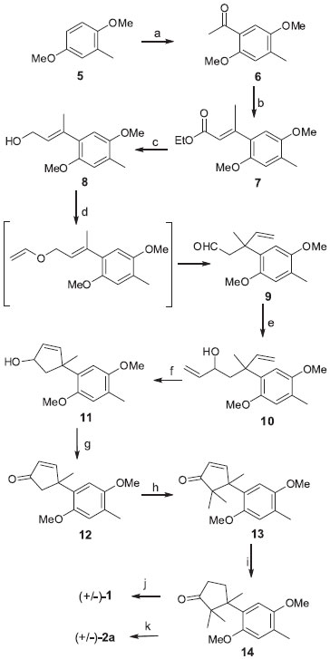 ![]() Esquema 1. Rota sintética racêmica para a enoquipodina A proposta por Srikrishna e colaboradores.10-12 Reagentes, condiçoes e rendimentos: (a) AcCl, CH2Cl2, SnCl4, 2 h, 0 ºC, t.a., 78%; (b) (EtO)2P(O)CH2COOEt, NaH, THF, refluxo, 5 h, 88%; (c) LiAlH4, Et2O, -70 °C, t.a., 2 h, 91%; (d) CH2=CHOEt, Hg(OAc)2, tubo selado, 100 °C, 10 h; 175 °C, 48 h, 63%; (e) CH=CHMgBr, THF, t.a., 1 h, 88%; (f) PhCH=Ru(Cl)2(PCy3)2 (5 mol %), CH2Cl2, t.a., 4 h, 95%; (g) PCC, NaOAc, CH2Cl2, t.a., 1 h, 86%; (h) NaH, THF-DMF, MeI, t.a., 12 h, 77%; (i) H2, Pd/C, EtOH, 1 h, 92%; (j) BBr3, CH2Cl2, 0 °C, t.a., 4 h, 78%; (k) NCA, CH3CN, H2O, t.a., 100%