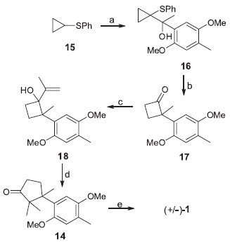 Os autores também propuseram a obtençao da (+/-)-enoquipodina B (2a) através da clivagem oxidativa do intermediário 14 utilizando nitrato cérico de amônio (NCA). Como resultado de estudos sobre a obtençao de derivados ciclobutanóis, intermediários chave na síntese de alguns cuparenos, Secci e colaboradores propuseram uma nova rota sintética para a (+/-)-enoquipodina A (Esquema 2).13 A síntese tem como material de partida sulfeto de ciclopropilfenila 15 que após metalaçao, reage com a 4-metil-2,5-dimetoxiacetofenona fornecendo o carbinol quiral 16. O intermediário chave ciclobutanona 17 foi obtido a partir da reaçao de 16 com ácido p-toluenossulfônico (APTS) em quantidades equimolares. Destaca-se, ainda, uma outra expansao de anel envolvendo o rearranjo semi-pinacol do ciclobutanol 18 que levou à obtençao da ciclopentanona 14, utilizando tanto APTS como eterato de trifluoreto de boro. O produto final (+/-)-1 foi obtido em 5 etapas com 44% de rendimento global.