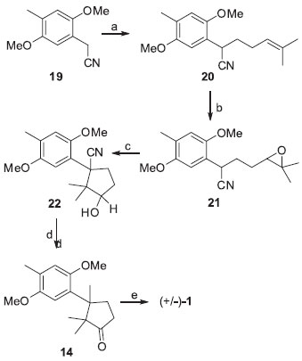 ![]() Esquema 2. Rota sintética racêmica para a enoquipodina A proposta por Secci e colaboradores.13 Reagentes, condiçoes e rendimentos: (a) i .n-BuLi, THF, -20 ºC; ii. 4-metil-2,5-dimetoxiacetofenona, THF, -20 ºC, t.a., 92%; (b) APTS, C6H6, refluxo, 91%; (c) brometo de isopropenilmagnésio, THF, -40 ºC, 71%; (d) APTS, C6H6, refluxo, 94% ou BF3 .OEt2, , CH2Cl2, -40 ºC, 91%; (e) BBr3, CH2Cl2, 0 °C a t.a., 4 h, 78%
