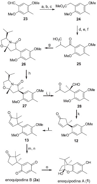 A síntese parte da 4-metil-2,5-dimetoxifenilacetonitrila (19) que, após alquilaçao com hexametildissilazana de lítio (HMDSLi) e 5-iodo-2-metilpent-2-eno, é convertida no intermediário com o centro quaternário benzílico 20. A α-aril-δ-epoxinitrila 21 foi obtida a partir da oxidaçao de 20 com ácido m-cloroperbenzóico. O derivado ciano-ciclopentílico 22 foi formado por meio da ciclizaçao regiosseletiva de 21 catalisada por paládio. A ciclopentanona 14 foi obtida após a reduçao de 22 com hidreto de diisobutilalumínio e oxidaçao de Dess Martin. O tratamento de 14 com iodeto de cicloexila forneceu a (+/-)-enoquipodina A (1) com 58% de rendimento global. Em 2004, Kuwahara e Saito propuseram a primeira rota de síntese total enantiosseletiva para as enoquipodinas A (1) e B (2a) (Esquema 4).15 A partir do 4-metil-2,5-dimetoxibenzaldeído (23), o intermediário quiral 26 foi sintetizado por meio de 7 etapas. Por sua vez, o centro estereogênico foi criado a partir de uma alquilaçao diastereosseletiva de 26 utilizando sec-butil-lítio e iodeto de metila. Com a remoçao do auxiliar quiral derivado do (S)-valinol, o intermediário 28 formado foi convertido na ciclopentenona 12 por meio de uma condensaçao aldólica intramolecular. A enoquipodina B (2a) foi obtida após dimetilaçao, seguida da hidrogenaçao e oxidaçao de 12. A reduçao de 2ª, utilizando hidrossulfito de sódio, permitiu ainda a obtençao da enoquipodina A (1) com 15% de rendimento global.