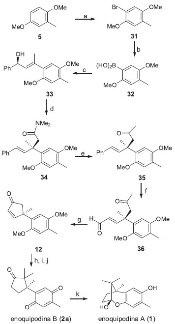 Em 2009, Yoshida e colaboradores estabeleceram uma nova síntese enantiosseletiva para a obtençao das enoquipodinas A (1) e B (2a) (Esquema 6) a partir do 2,5-dimetoxitolueno.17 Destaca-se nesta abordagem a construçao do centro quartenário por meio da adiçao do ácido arilborônico 32 a um aleno quiral, catalisada por paládio para a obtençao de 33. Após um rearranjo de Enchenmoser-Claisen, o álcool alílico 33 foi convertido na amida 34. A reaçao de 34 com metil-lítio seguida pela clivagem oxidativa da ligaçao dupla forneceu o cetoaldeído 36, que foi transformado no intermediário ciclopentenona 12 a partir de uma condensaçao aldólica intramolecular. As enoquipodina A (1) e B (2a) foram obtidas a partir de 12 com 6% e 10% de rendimento global, respectivamente, utilizando a mesma metodologia descrita por Kuwahara e Saito.15,16