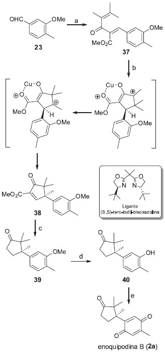 Recentemente, Frontier e colaboradores relataram a obtençao da enoquipodina B (2a) em apenas seis etapas a partir do 3-metoxi-4-metilbenzaldeído com 38% de rendimento global (Esquema 7).18 Os centros quaternários vicinais foram criados em uma única etapa por meio de um processo sequencial envolvendo uma ciclizaçao de Nazarov e um rearranjo de Wagner-Meerwein quimiosseletivo para a obtençao de 38. A transformaçao é mediada por um complexo de cobre (II) e um ligante quiral bidentado, cuja estrutura mostrou influenciar tanto os excessos enantioméricos da ciclizaçao quanto a quimiosseletividade do rearranjo catiônico. Embora baixos excessos enantioméricos tenham acompanhado a ciclizaçao (20% e.e.), a utilizaçao do ligante mostrado no esquema abaixo forneceu uma boa quimiosseletividade para a migraçao do grupo aromático em detrimento à migraçao de hidreto. O grupo carbometóxi foi removido pela reaçao de 38 com iodeto de sódio e ácido acético em diglima sob refluxo para a obtençao de 39. A desmetilaçao de 39 com tribrometo de boro proporciona a obtençao do intermediário 40 que foi facilmente convertido para enoquipodina B (2a) por oxidaçao com sal de Fremy.