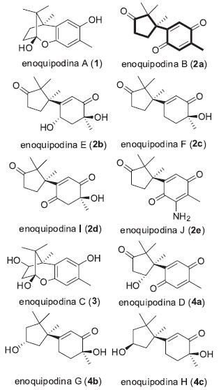 ![]() Figura 1. Estruturas químicas das enoquipodinas (núcleo cuparênico em destaque na estrutura 2a)