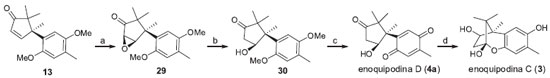 Os mesmos autores relataram a obtençao das enoquipodinas C (3) e D (4a) em cinco e quatro etapas, respectivamente (Esquema 5).16 O epóxido 29 foi obtido a partir de uma epoxidaçao estereosseletiva de 13 utilizando peróxido de hidrogênio em meio alcalino. O composto 29 foi convertido em 30 a partir de uma clivagem redutiva utilizando disseleneto de difenila e boroidreto de sódio. Assim, a oxidaçao de 30 com nitrato cérico de amonio (NCA) levou à síntese da enoquipodina D (4a) com 4% de rendimento global. A enoquipodina C (3), por sua vez, foi sintetizada com 3,5% de rendimento global a partir da reduçao de 4a.