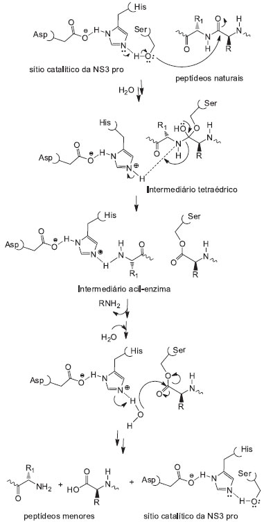 A tríade é uma estrutura coordenada que consiste de três aminoácidos: histidina, aspartato e serina, onde cada aminoácido desempenha uma tarefa específica no processo de catálise. A cadeia lateral da Ser139 (-CH2-OH) é ativada por uma catálise básica mediada por Asp81 e His57 através de interaçoes por ligaçao hidrogênio (numeraçao dos resíduos referente à serina protease do HCV). A Ser do sítio ativo (nucleófilo ativado) ataca, entao, a ligaçao amídica do substrato polipeptídico, formando um intermediário oxiânion tetraédrico. Este intermediário se rompe pela eficiente transferência de próton da His para formar uma amina e um intermediário acil-enzima. A liberaçao da porçao N-terminal e a introduçao de uma molécula de H2O levam ao ataque da carboxila do substrato, formando o fragmento C-terminal do substrato e regenerando a enzima (Esquema 1).36