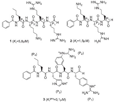 PEPTIDEOMIMÉTICOS INIBIDORES DE PROTEASES Protease do DENV Poucos inibidores da NS3 protease do vírus da dengue de natureza peptideomimética têm sido descritos na literatura, dentre eles está a aprotinina (um antifibrinolítico natural), um inibidor padrao de proteases incluindo tripsina, quimotripsina, plasmina, ativador tissular do plasminogênio e calicreína tissular e plasmática. A aprotinina apresentou um IC50=65nM contra serina protease recombinante do DENV-2.44 Algumas estratégias têm sido empregadas na pesquisa de inibidores da NS3/NS2B protease do DENV com vários graus de sucesso, dentre elas a síntese racionalmente planejada de peptideomiméticos e ciclopeptídeos,45 screening virtual baseado na estrutura, screening de produtos naturais, entre outros.46 Entretanto, somente poucos inibidores peptideomiméticos e compostos estruturalmente pequenos sao descritos.47 Na estratégia de síntese racionalmente planejada de peptideomiméticos, Yin e colaboradores descreveram o composto do tipo aldeído 1 (Figura 2), o qual mostrou ser um inibidor reversível e competitivo, com um Ki de inibiçao igual a 5,8 mM contra a NS3 protease do DENV-2.48 Um estudo de relaçao estrutura-atividade (SAR) foi realizado na tentativa de encontrar novos inibidores.49 Neste estudo, o composto 1 serviu de protótipo para o entendimento das interaçoes farmacofóricas inibidor-enzima e desenvolvimento de novas moléculas peptideomiméticas, as quais vieram a confirmar a preferência da enzima por resíduos básicos de Arg na porçao terminal, especialmente na posiçao P2. Como resultado dos estudos de SAR obteve-se o tripeptídeo 2, mais ativo, mostrando um Ki=1,5µM (Figura 2).50,48
