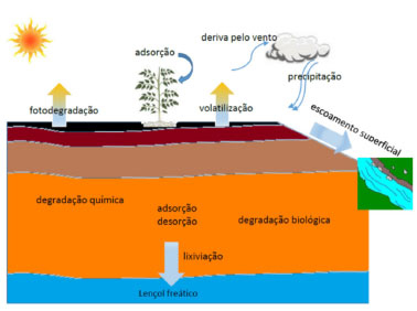![]() Figura 1. Alguns processos que afetam o destino ambiental dos agrotóxicos. Adaptado de Spadotto et al.4