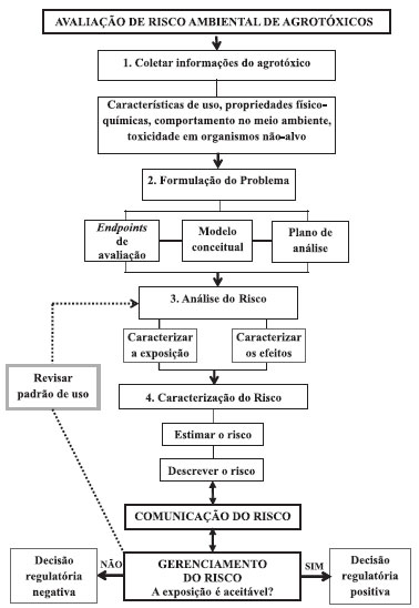 A avaliação do potencial risco ao meio ambiente pelo uso dos agrotóxicos é uma importante etapa no processo de registro de agrotóxicos de vários países. Nos Estados Unidos, a Lei Federal de Controle de Inseticidas, Fungicidas e Rodenticidas (Federal Insecticide, Fungicide, and Rodenticide Act, FIFRA) fornece a base para a regulação, venda e distribuição dos agrotóxicos no país, e possui entre seus elementos chaves o registro destes produtos com base em um padrão de avaliação de riscos e benefícios.6 A publicação em 1998 do Guideline on Ecological Risk Asssessment pela agência ambiental americana (United States Enviromental Protecion Agency, USEPA), uma revisão da publicação de 1992,7 foi um marco para um novo paradigma de avaliação de risco ambiental. Na Europa, a European and Mediterranean Plant Protection Organisation desenvolveu guias de avaliação de risco ambiental de agrotóxicos com procedimentos flexíveis que podem ser adaptados para serem usados de acordo com as prioridades dos países membros da comunidade européia.8 Outros países, como Canadá,9 Austrália10 e Japão,11 também possuem procedimentos estabelecidos para avaliação de risco ambiental, enquanto que na China estes ainda estão sendo desenvolvidos.12 No Chile,13 o Ministério da Agricultura desenvolveu uma base de dados de agrotóxicos que permite uma avaliação de risco simplificada, baseada no trabalho de Finzio et al.,14 para determinar a concentração ambiental esperada do agrotóxico após seu uso. No Brasil, a avaliação de risco ambiental de agrotóxicos foi prevista na Portaria IBAMA nº 84/1996,15 e posteriormente na regulamentação da Lei nº 7802 pelo Decreto nº 4074/2002.16 Inicialmente, o IBAMA concentrou seus esforços em estabelecer métodos para avaliação do potencial de perigo das substâncias, definindo protocolos de interesse e qualificando o processo de avaliação. Mais recentemente, o IBAMA passou a adotar a estrutura conceitual do processo de avaliação de risco ambiental definido pela USEPA na avaliação de novos ingredientes ativos.17 A presente revisão tem como objetivos delinear os princípios que regem o processo de avaliação de risco ambiental de agrotóxicos e como este processo é conduzido no Brasil, e discutir estudos relacionados com o tema conduzidos no país nos últimos anos.
