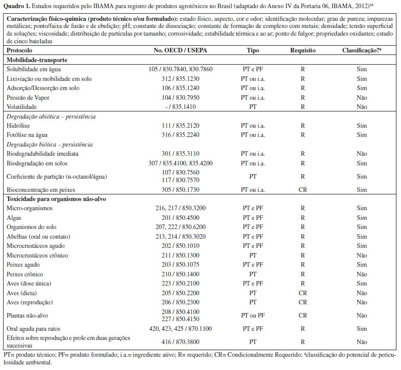 Coleta de informações Na primeira etapa da avaliação de risco ambiental do uso de agrotóxicos (Figura 2) é feita a coleta de informações referentes aos potenciais usos do produto, instruções de uso no campo, propriedades físico-químicas do ingrediente ativo e do produto final, persistência ambiental, destino e transporte, e informações laboratoriais sobre efeitos ambientais, incluindo a toxicidade para organismos não-alvo.7,8 Estes dados podem ser obtidos da literatura, bases de dados e/ou a partir de resultados de testes laboratoriais exigidos pelas autoridades regulatórias, conforme estabelecido em legislação específica. No Brasil os estudos exigidos para avaliação ambiental de um produto agrotóxico foram definidos pela Portaria IBAMA nº 84/1996,15 recentemente modificada pela Portaria IBAMA nº 6/2012,18 e estão apresentadas no Quadro 1. Para cada agrotóxico a ser registrado, são exigidos 23 estudos físico-químicos para produto técnico (obtido diretamente da matéria-prima e com teor definido de ingrediente ativo e impurezas), e dez estudos físico-químicos para produto formulado ou ingrediente ativo. Para se avaliar a toxicidade para organismos não-alvo, são exigidos nove estudos para produto técnico ou ingrediente ativo, e oito estudos para o produto formulado. Adicionalmente são exigidos três estudos do comportamento do agrotóxico em solos nacionais e um de biodegradabilidade imediata.