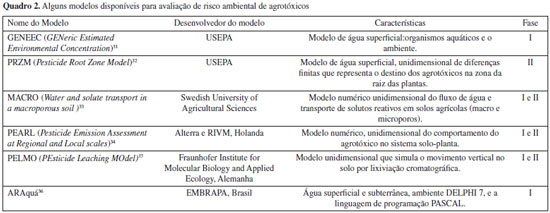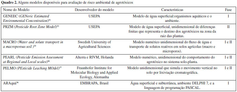 CONCLUSÃO Os processos que determinam a distribuição dos agrotóxicos no meio ambiente são múltiplos, e alguns são determinantes para compreender o risco para organismos aquáticos, como o escoamento superficial, lixiviação, sorção e degradação. A aplicação de modelos matemáticos e ferramentas informatizadas que auxiliem a compreender estes processos é importante para subsidiar uma tomada de decisão cientificamente embasada para o registro de um produto e identificar a necessidade de aprofundamento do conhecimento sobre o comportamento ambiental dos agrotóxicos em diferentes condições, racionalizando o processo de tomada de decisão. Vários documentos guias e modelos computacionais para a condução de avaliação de risco ambiental de agrotóxicos estão disponíveis atualmente e alguns trabalhos já foram realizados no sentido de adaptar ou desenvolver modelos para organismos aquáticos propostos em outros países para as condições edafoclimáticas do Brasil. Adicionalmente, é necessário organizar dados toxicológicos para organismos aquáticos que incluam não só espécies padrões indicadas em protocolos internacionais, mas também espécies locais de forma a contribuir para a construção de modelos que permitam extrapolar as conclusões da avaliação de risco para espécies representativas das regiões estudadas. Apesar de o Brasil possuir um arcabouço legal que prevê a avaliação de risco ambiental no processo de registro de agrotóxicos, até a presente data este processo não foi implementado sistematicamente pelo IBAMA, e os procedimentos se limitam a modelos de fase I. O avanço deste procedimento para etapas e ferramentas mais complexas ainda apresenta uma série de limitações, principalmente devido à larga extensão territorial do país, diversidade edafoclimática, e biodiversidade. A contribuição da comunidade científica neste processo é fundamental no sentido de avaliar cientificamente a viabilidade da aplicação de ferramentas e modelos já existentes ou no desenvolvimento de modelos que sejam adequados aos cenários brasileiros.