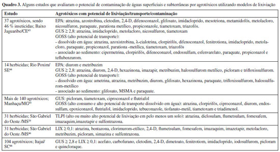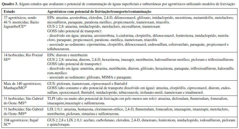 IMPACTO DO USO DE AGROTÓXICOS EM ORGANISMOS AQUÁTICOS NO BRASIL Estudos de avaliação de risco ambiental O número de estudos conduzidos sobre o tema no Brasil cresceu nos últimos anos, porém essa ainda é uma área que requer muitos avanços no país. Neste artigo, alguns estudos relacionados ao ambiente aquático realizados nos últimos 10 anos são discutidos. Primeiramente, estudos que utilizaram métodos de triagem são abordados, seguidos de estudos com modelos mais complexos (conforme descrito na análise de fases) e estudos que avaliaram a sensibilidade de organismos aquáticos regionais em comparação a organismos padrões utilizados em protocolos internacionais. O Quadro 3 mostra alguns estudos que avaliaram o potencial de contaminação de águas superficiais e subterrâneas por agrotóxicos utilizando métodos de triagem. A maioria dos estudos utilizou dados da literatura relativos às propriedades físico-químicas dos agrotóxicos e características do solo.