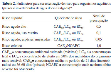 Modelos para avaliar o risco ambiental de agrotóxicos também têm sido desenvolvidos no Brasil. O sistema computacional ARAquá (Avaliação de Risco Ambiental de Agrotóxico) considera as possíveis contaminações de corpos d'água superficiais e subterrâneos pela comparação de suas concentrações estimadas em cenários de uso agrícola no país com parâmetros de qualidade de água (Quadro 2).36 O ACHA (Avaliação da Contaminação Hídrica por Agrotóxico) é capaz de simular perfis de umidade do solo e concentração do agrotóxico em função do tempo,37 porém é uma ferramenta que ainda precisa ser validada. Caracterização dos efeitos A caracterização dos efeitos ecológicos avalia a evidência de que a exposição a um dado agrotóxico causa a resposta observada. A caracterização se inicia pela avaliação dos dados para especificar os efeitos adversos relevantes, verificando se eles são consistentes com os endpoints de avaliação e se as condições em que eles ocorrem são consistentes com o modelo conceitual definido na formulação do problema. As concentrações com efeitos específicos de curto e longo prazo para as espécies de interesse podem ser expressas em termos de CE50 (concentração efetiva que afeta 50% dos indivíduos), CL50 (concentração que causa morte em 50% dos animais testados) e NOAEC (no observed adverse effect concentration). A Tabela 1 mostra estes parâmetros para alguns agrotóxicos registrados no Brasil. Caracterização de risco A caracterização de risco é a fase final da avaliação de risco ambiental, e integra as informações das etapas anteriores, incluindo as hipóteses, incertezas e limitações da análise. O produto final inclui uma interpretação das adversidades ecológicas/ambientais esperadas e descrições das incertezas e linhas de evidência, formando as bases sobre as quais as decisões de gerenciamento do risco podem ser feitas. A caracterização do risco inclui a estimativa e a descrição do risco (Figura 2). Estimativa do risco Na estimativa do risco, uma abordagem determinística é feita pelo cálculo do Quociente de Risco (QR), dividindo-se as estimativas de exposição (CAE) pelos valores agudos e crônicos de ecotoxicidade (QR = exposição/toxicidade). Estes QR são comparados com os níveis de preocupação, que são critérios definidos pela autoridade regulamentadora. A Tabela 2 mostra os parâmetros para caracterização de risco para organismos aquáticos utilizados pela USEPA.38 O risco potencial a organismos não-alvo pode existir quando o QR ultrapassa o nível de preocupação, o que pode requerer uma ação regulatória. O QR fornece um meio eficiente e barato de identificar situações de alto ou baixo risco, e podem permitir que as decisões de gestão de risco sejam feitas sem a necessidade de mais informações. Porém, enquanto o quociente pode ser útil para responder quando os riscos são altos ou baixos, ele pode não ser útil para um gerenciador de risco que exige uma quantificação incremental dos riscos. Além disso, o método do quociente de risco pode não ser o mais favorável para predizer efeitos secundários.7 Em situações onde esta predição é desejada, utiliza-se ferramentas computacionais para conduzir uma estimativa de risco probabilística.