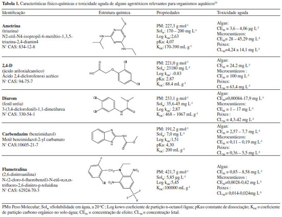 Sempre que possível, os estudos exigidos pelo IBAMA para registro devem ser conduzidos de acordo com protocolos internacionalmente aceitos, como aqueles publicados pela OECD (Organisation for Economic Co-operation and Development),19,20 ou pelo USEPA.21 Esses estudos são realizados em ambiente de laboratório, sob condições controladas e podem não refletir uma situação real de campo. Os protocolos recomendam que estudos de lixiviação, adsorção e biodegradação em solos devem ser conduzidos em solos característicos da região ou país de interesse.19 A maioria dos protocolos de estudos de toxicidade sugere algumas espécies como organismo teste, porém outras espécies podem ser usadas se adequadamente justificado.20 A utilização de espécies alternativas para avaliar a toxicidade de organismos aquáticos será discutida posteriormente neste artigo. Os estudos devem também ser conduzidos de acordo com os princípios de Boas Práticas de Laboratório (BPL) em laboratórios monitorados por autoridades reconhecidas, que no Brasil é o Instituto Nacional de Metrologia, Qualidade e Tecnologia (INMETRO).22 Tal exigência é importante para garantir que as informações usadas na avaliação de risco sejam precisas e rastreáveis. A Tabela 1 apresenta algumas características físico-químicas e toxicidade aguda para organismos aquáticos de alguns agrotóxicos utilizados no país.23 Atrazina, diurom e 2,4-D são herbicidas registrados para uso em diversas culturas, sendo o 2,4-D o mais hidrossolúvel (Solw: 23180 mg L-1) e o menos tóxico entre eles (maior CL50 e CE50). A flumetralina, um regulador de crescimento para cultura do fumo, tem a maior toxicidade para peixes (CL50= 0,014-0,024 mg L-1), enquanto o fungicida carbendazim é o mais tóxico no modelo para microcustáceos (CE50 = 0,11 - 0,19 mg L-1).