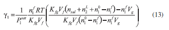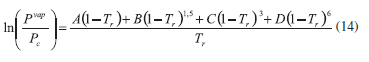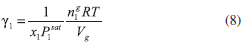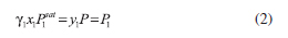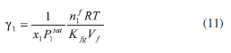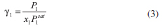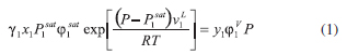 sendo que: γ é o coeficiente de atividade; é o coeficiente de fugacidade; x fração molar na fase líquida; y é a fração molar na fase vapor; T é a temperatura do sistema; R a constante dos gases; P é a pressão do sistema; Psat é a pressão de saturação em uma dada temperatura. Nos casos estudados a relação entre o termo exponencial, designado por correção de Poynting, o coeficiente de fugacidade na saturação e o coeficiente de fugacidade na fase vapor é igual a 1, o que reduz a Equação 1 em: