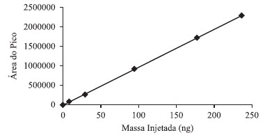 RESULTADOS E DISCUSSÃO A curva de resposta para o etanol forneceu coeficiente angular de 9731,8 e coeficiente linear de -12046 representando a relação entre a área do pico de etanol no cromatograma e a massa de etanol extraída, com um coeficiente de determinação (R2) de 0,99996, como pode ser observado na Figura 1. O tempo de extração utilizado nos experimentos foi de 20 minutos para garantir o completo equilíbrio. O tempo de dessorção foi de 5 minutos para garantir uma completa dessorção na fibra de SPME.