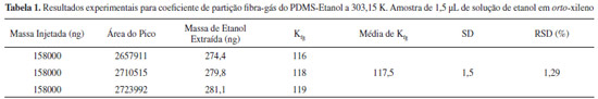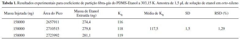 PARTE EXPERIMENTAL Os reagentes utilizados foram obtidos da Vetec Química Fina Ltda sendo: etanol, cloreto de sódio e cloreto de amônio, todos com pureza superior a 99,4%. A fibra de PDMS (polidimetilsiloxano) de espessura 100 µm foi obtida da Supelco. O cromatógrafo a gás utilizado no experimento foi um GC-2010 Shimadzu equipado com detector de ionização em chama (DIC; FID = Flame Ionization Detector), uma coluna capilar HP-Innowax (polietileno glicol reticulado; crosslinked PEG) de dimensões 60 m x 0,32 mm x 0,25 µm, um liner da SGE Analytical Science Pty Ltd, de diâmetro interno 0,75 mm (próprio para SPME) e hélio ultrapuro (99,999%) como gás de arraste. Frascos âmbar de 40 mL com septo de PTFE/silicone serviram para o confinamento e estudo das misturas líquidas. Soluções padrão de etanol em orto-xileno (obtido da Vetec Química Fina Ltda, pureza 99,7%) foram preparadas com concentrações distintas. A curva de calibração para o etanol foi construída injetando-se volumes precisos de 1 µL de solução padrão no injetor do cromatógrafo a gás. A pressão no injetor foi mantida constante a 123,6 kPa em todo o período de análise, o injetor foi mantido em modo splitless por 4 minutos e em seguida uma razão de split igual a 1:8, a temperatura no injetor e detector foram mantidas a 250 ºC. A temperatura inicial da coluna foi de 50 ºC, sendo mantida por 5 minutos, e posteriormente elevando-se a 80 ºC, a uma taxa de aquecimento de 10 ºC min-1, mantendo-se nesta temperatura por mais 1 minuto. O tempo de extração foi determinado por meio do preparo de amostra gasosa pela injeção de 1 µL de solução em orto-xileno do analito em recipientes de 40 mL vedados com septo PTFE/silicone. A temperatura foi controlada por um banho termostático (LAUDA, modelo RM 6B). Depois de preparada a amostra, a temperatura foi mantida constante e a fibra de PDMS foi exposta por determinado tempo, sendo então levada ao injetor do cromatógrafo a gás para a quantificação de material extraído. O cromatógrafo foi mantido nas mesmas condições da construção da curva de calibração. Os experimentos foram realizados aumentando-se o tempo de exposição até que a massa extraída não mais variasse, alcançando o equilíbrio. De forma análoga ao tempo de extração, foram preparadas amostras gasosas de concentração conhecida, pela injeção de solução de etanol em orto-xileno (1 µL) no interior de recipientes âmbar de 40 mL vedados com septo PTFE/silicone. A temperatura no interior do frasco foi mantida constante por um banho termostático e a fibra foi exposta durante o tempo de extração previamente determinado. Em seguida a fibra foi levada ao injetor do cromatógrafo para a dessorção térmica e quantificação do material extraído, permitindo a determinação do coeficiente de partição (Kfg), a partir da Equação 9, nas temperaturas de 30 e 40 ºC. O cromatógrafo foi mantido nas mesmas condições da construção da curva de calibração. As pressões de vapor (saturação) do etanol foram determinadas utilizando a equação de Wagner (Equação 14). Os valores para as constantes A, B, C e D podem ser encontrados na literatura.10