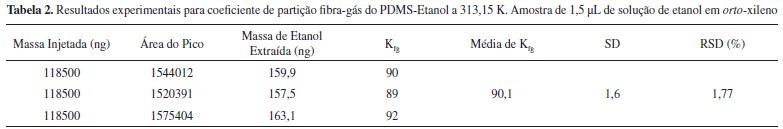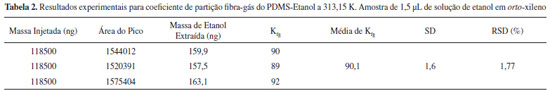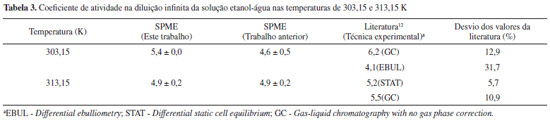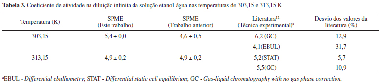 As Figura 1 e 2 mostram os valores dos coeficientes de partição determinados para o etanol nas temperaturas de 303,15 e 313,15 K e, a partir destes valores, determinou-se os coeficientes de atividade na diluição infinita utilizando o método proposto. O uso da técnica de SPME para o cálculo do coeficiente de atividade já foi utilizado em trabalhos anteriores com sucesso para sistemas binários, como soluções de tolueno, etil-benzeno e xileno (TEX) em metanol e soluções de hidrocarbonetos (n-hexano, n-heptano e ciclohexano) em furfural.2,11,12 Neste trabalho os coeficientes de atividade em diluição infinita foram determinados para o sistema etanol-água em duas temperaturas, 303,15 e 313,15 K. Para os cálculos foram utilizados dois métodos: o modelo desenvolvido anteriormente a partir de equacionamentos termodinâmicos e já publicados2,11 e o novo modelo proposto. Os resultados são mostrados na Tabela 3 e confrontados com outras técnicas da literatura.13 Verificou-se que os valores são consistentes e que apresentam desvios aceitáveis, validando o método adotado. Nota-se que os valores dos coeficientes de atividade têm forte influência da técnica empregada.