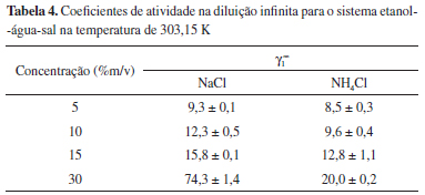 Na adição de um sal inorgânico em um sistema binário, como etanol-água, ocorre a modificação da pressão de vapor das especies em que o sal é mais soluvel.5 Isto impossibilita o uso da equação proposta em trabalhos anteriores,2,11 pois ainda não é possivel a determinação da variação da pressão de vapor utilizando a SPME como técnica de análise, que é baseada na igualdade das fugacidades.9 Os resultados mostrados nas Tabelas 4 e 5 são para os coeficientes de atividade para os sistemas etanol-água-sal. A abordagem proposta leva em consideração apenas a pressão de vapor do etanol, que não é alterada quando o sal inorgânico possuir baixa solubilidade no soluto, que é o caso dos sais utilizados neste trabalho. No sistema estudado, apenas a pressão de vapor da água é alterada pois os sais utilizados possuem uma maior afinidade. Mesmo em condições de diluição temos uma solução e como explicado o sal atua mais diretamente com a água. Isso pode ser verificado com a modelagem termodinâmica, pois as interações água-sal são maiores que as etanol-sal, ou etanol-íons.