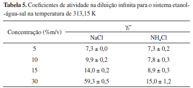 CONCLUSÕES Estudou-se, por meio da técnica de SPME, o equilíbrio líquido-vapor para o sistema ternário etanol-água-sal nas temperaturas de 303,15 e 313,15 K. Os sais utilizados foram o NaCl e o NH4Cl, que possuem baixa solubilidade no soluto escolhido. O equacionamento proposto permitiu o cálculo do coeficiente de atividade na diluição infinita para os sistemas estudados. O modelo proposto permite o cálculo do coeficiente de atividade em sistemas em que o sal inorgânico apresenta baixa solubilidade no soluto. O acréscimo da concentração de sal na solução fez com que o coeficiente de atividade aumentasse proporcionalmente, já que os dois sais possuem efeito salting out. Para o sistema binário etanol-água, o novo modelo apresentou desvios que variaram de 5%, 7% a 31,7% com a literatura, dependendo do método utilizado. Estes resultados podem ser considerados válidos, pois na literatura é possível encontrar desvios maiores que 32%. Quando comparado o método empregado anteriormente10 com a abordagem nova verificou-se desvios menores. O NaCl, na maior concentração estudada (ponto próximo a saturação, 30% m/v) e a 303,15 K apresentou os maiores valores de coeficiente de atividade em diluição infinita, como esperado. Com os resultados apresentados conclui-se que o método é válido para a determinação dos coeficientes de atividade na diluição infinita, porém requer mais estudos e mais dados para comparação com a literatura de modo a validá-lo para outros sistemas salinos de baixa solubilidade.