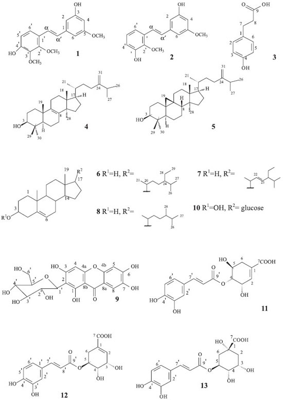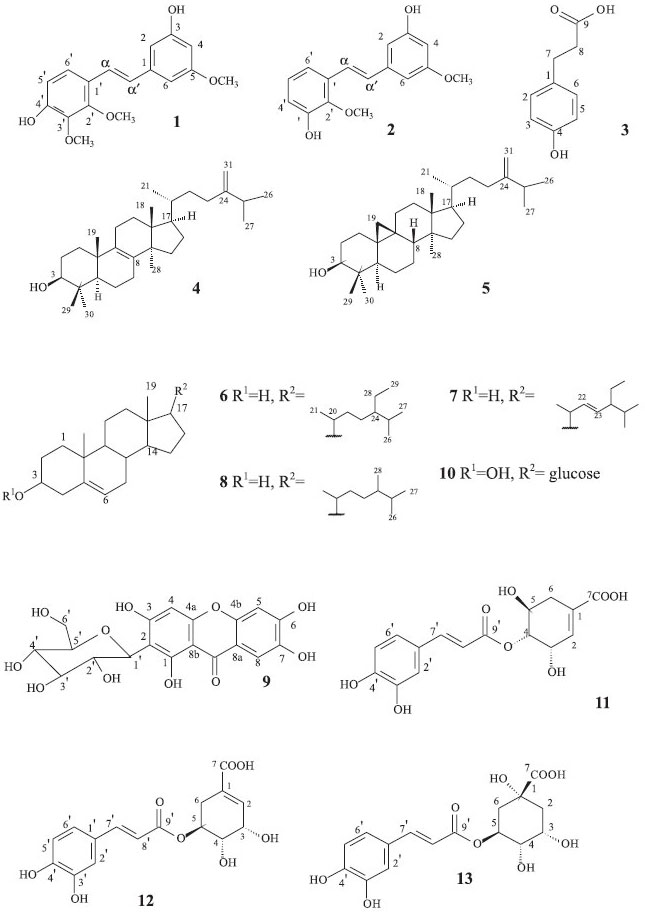 IDepartamento de Química, Universidade Estadual de Maringá, Av. Colombo 5790, 87020-900 Maringá - PR, Brasil Recebido em 27/11/2013 * e-mail: ampomini@uem.com ABSTRACT The chemical study of the orchid Maxillaria picta resulted in the isolation of the bioactive stilbenes phoyunbene B and phoyunbene C, in addition to four phenolic acids, one xanthone, steroidal compounds and two triterpenes. Crude extract, fractions, subfractions and the isolated xanthone were evaluated for anticancer activity against human tumor cell lines and against evolutionary forms of T. cruzi and L. amazonensis. The structures of the compounds were determined by GC-MS, and 1H NMR, 13C NMR spectral methods as well as bidimensional techniques. INTRODUÇÃO Plantas da família Orchidaceae têm se tornado alvo de estudos fitoquímicos sendo uma rica e variada fonte de compostos que apresentam diversos tipos de atividades biológicas. Já foram relatados os isolamentos de triterpenos,1 alcaloides,2 fenantrenos,3 flavonoides,4 além de estilbenos e ácidos fenólicos,5,6 muitos deles demonstrando propriedades farmacológicas, tais como antioxidante, anticancerígena e analgésica.2,4,5 Pouco se sabe, porém, sobre substâncias com potencial biológico de orquídeas do gênero Maxillaria. Estudos químicos e biológicos foram realizados apenas com a espécie M. densa, nativa do México, utilizada popularmente como relaxante muscular,7 a partir da qual foram identificados fenantrenos e estilbenoides com atividades antifúngicas.8,9 A espécie M. picta é endêmica do bioma Mata Atlântica, no Sul e Sudeste do Brasil, principalmente sobre a Serra do Mar, sendo comumente encontrada em modo epifítico sobre perobas. A espécie é facilmente identificada pela presença de seus pseudobulbos bifoliados, sulcados a canaliculados e pelas suas flores campanuladas, duradouras e sem recompensas florais aos polinizadores,10 mas que apresentam fragrâncias e colorações que atraem abelhas operárias sem ferrão do gênero Trigona.11 Alguns trabalhos realizados com M. picta descrevem os componentes florais voláteis que se caracterizam por altas concentrações do monoterpeno linalol.12 O presente trabalho descreve o estudo químico e farmacológico do extrato bruto e frações de M. picta, com a realização de ensaios para atividade antiproliferativa contra diversas linhagens de células cancerosas humanas bem como ensaios tripanocida e leishmanicida, agentes causadores de doenças tropicais negligenciadas de considerável importância, tendo em vista a atual defasagem medicamentosa para o tratamento dessas enfermidades.