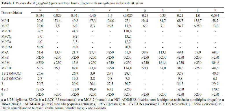 PARTE EXPERIMENTAL Procedimentos gerais Os espectros de RMN de 1H e de RMN de 13C foram obtidos em espectrômetros Varian Mercury Plus, operando a 300,06 MHz para 1H e 75,45 MHz para 13C. Também foram obtidos os espectros pela técnica DEPT e correlações bidimensionais a partir dos mapas de contornos COSY, HMBC e HSQC. Os deslocamentos químicos foram dados em ppm, tendo como referência interna o TMS. Os solventes utilizados foram: CDCl3, CD3OD, D2O e DMSO-d6, Aldrich ou Isotec. Os espectros de massas de baixa resolução foram obtidos com um cromatógrafo em fase gasosa acoplado a um espectrômetro de massas modelo Focus GC (Thermo-Finnigan). As cromatografias em coluna foram realizadas utilizando sílica gel 60 e as filtrações foram feitas em Sephadex LH 20. Os diâmetros das colunas utilizadas variaram de acordo com a massa do material a ser tratado. O acompanhamento das cromatografias em coluna foi feito por análises de cromatografia em camada delgada (CCD). As placas cromatográficas foram preparadas com fase estacionária sílica-gel 60 G e sílica-gel 60 GF, com 0,25 mm de espessura. As substâncias separadas nas placas cromatográficas foram visualizadas através do revelador anisaldeído. Material vegetal A espécie vegetal M. picta foi coletada no campus da Universidade Estadual de Londrina (UEL) e identificada pelo Prof. Dr. Ricardo Tadeu de Faria, em março de 2012. Um espécime é mantido vivo no orquidário da UEL e uma exsicata é mantida sob código FUEL22314. Isolamento dos constituintes químicos Aproximadamente 6,0 kg do material vegetal (raízes, folhas e pseudobulbos) foram moídos e submetidos a uma extração exaustiva com uma mistura de CHCl3/MeOH (3:7) (16 L × 3) a frio. Após a evaporação sob pressão reduzida, obteve-se um extrato bruto (188,0 g). Parte do extrato bruto clorofórmico-metanólico (142,0 g) foi solubilizado em 500 mL de MeOH:H2O 1:1 e submetido à partição em hexano, CHCl3, AcOEt e n-BuOH, resultando nas frações hexânica (MPH, 12,8 g), CHCl3 (MPC, 30,7 g), AcOEt (MPA, 21,5 g), n-BuOH (MPB, 7,0 g) e a remanescente MeOH/H2O (MPM, 67,2 g). A fração MPC foi solubilizada sucessivamente com hexano (MPCH, 5,5 g), CHCl3 (MPCC, 12,1 g), AcOEt (MPCA, 6,4 g) e MeOH (MPCM, 0,8 g), resultando nas suas respectivas subfrações. A fração CHCl3-AcOEt (523,1 mg) foi submetida a uma separação em cromatografia em Sephadex LH 20 (MeOH), resultando em 71 frações. Após análise por CCD as frações foram agrupadas de acordo com sua similaridade cromatográfica. A subfração CA-1 (102,1 mg) foi submetida a uma cromatografia em coluna de Sephadex LH 20 (MeOH). Esta separação resultou no isolamento das substâncias 1 e 2 na forma de mistura (22,3 mg), enquanto que a fração CA-2 mostrou conter a substância 3 (21,0 mg). A fração CHCl3-Hexânica (3,60 g) foi submetida a cromatografia em coluna em gel de sílica, eluida com hexano, CHCl3, AcOEt e MeOH em gradiente crescente de polaridade. A subfração CH-1 (10,3 mg) resultou no isolamento da mistura 4 e 5 (14,3 mg), enquanto que a subfração CH-2 (123,6 mg) também foi submetida a cromatografia em coluna em gel de sílica, resultando na identificação da mistura de substâncias 6, 7 e 8 de massa igual a 30,3 mg. A fração CHCl3-CHCl3 (7,11 g) foi submetida a cromatografia em coluna em gel de sílica com hexano, CHCl3, AcOEt e MeOH em gradiente crescente de polaridade. A fração CC-1 (741,0 mg) foi submetida ao mesmo processo, resultando novamente na mistura 1 e 2 (13,3 mg). A fração hexânica (5,86 g) foi também submetida a cromatografia em coluna em gel de sílica utilizando como eluentes hexano, CHCl3 e MeOH, em gradiente crescente de polaridade. As subfrações H-1 (376,8 g) e H-2 (380,3 g) foram submetidas a um fracionamento em coluna de sílica-gel resultando no isolamento da mistura de compostos 4 e 5 (22,9 mg) e 6, 7 e 8 (30,3 mg), respectivamente. A fração AcOEt (566,0 mg) foi submetida a uma filtração em Sephadex LH 20 somente com MeOH, resultando em 126 frações. A fração A-1 (68,1 mg), submetida a uma filtração em Sephadex LH 20, levou ao isolamento da substância 9 (4,8 mg), enquanto que a fração A-2 (115,7 mg) realizada nas mesmas condições, levou ao isolamento das substâncias 10 (4,1 mg), 11 (10,3 mg) e da mistura 11 e 12 (12,7 mg). A filtração em Sephadex LH 20 da fração A-3 (20,7 mg), resultou no isolamento da mistura das substâncias 11 e 13 (3,1 mg). Parte da fração MeOH/H2O (601,8 mg) foi submetida a um fracionamento em Sephadex LH-20 usando como eluentes H2O e MeOH em gradiente decrescente de polaridade, resultando no isolamento da substância 9 (26,0 mg). Além disso, a substância 9 foi obtida em grande quantidade (2,54 g) a partir da precipitação dessa fração. Avaliação da atividade antiproliferativa A avaliação da atividade antiproliferativa do extrato bruto, frações e dos compostos isolados foi realizada contra diversas linhagens de células tumorais humanas. Linhagens celulares Para a realização da triagem in vitro foram utilizadas as linhagens de células tumorais humanas [rim (786-0), melanona (UACC-62), leucemia (K562) mama (MCF-7), ovário (OVCAR-3), próstata (PC-3), cólon (HT29), pulmão (NCI-H460), glioma (U251) e ovário resistente (NCI-ADR/RES), queratinócito humano (HaCat)] cedidas pelo Instituto Nacional do Cancer (NCI/EUA, Frederick MA). Todas as linhagens foram cultivadas em RPMI 1640 com 5% de soro fetal bovino inativado (SFB) e 1% de penicilina/estreptomicina (1000 U mL-1 : 1000 µg mL-1), em atmosfera de 5% de CO2, a 37 ºC e ambiente úmido. Teste de atividade antiproliferativa em cultura de células tumorais humanas Células tumorais humanas (100 µL suspensão celular compartimento-1, densidade de inoculação entre 3×104 e 6,5×104 cel mL-1) foram expostas a diferentes concentrações das amostras em DMSO/RPMI/SFB 5% (0.25, 2.5, 25 e 250 µg mL-1) e incubadas a 37 ºC, 5% de CO2, em ambiente úmido, por 48