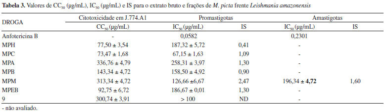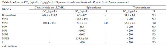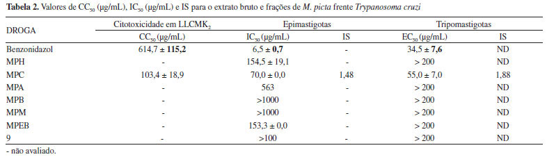 O extrato bruto e frações de M. picta também foram avaliados quanto à atividade antiproliferativa contra formas epimastigotas e tripomastigotas de T. cruzi. A fração MPC apresentou atividade antiproliferativa sobre as formas epimastigotas (IC50 70 µg mL-1) bem como afetou de modo expressivo a viabilidade das formas tripomastigotas (EC50 55 µg mL-1). Por manifestar ação relevante sobre esta última forma, a fração clorofórmica foi, então, submetida ao ensaio de citotoxicidade em células LLCMK2, apresentando uma CC50 de 103,35 µg mL-1, conforme observado na Tabela 2.