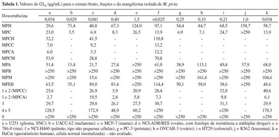 RESULTADOS E DISCUSSÃO O extrato bruto clorofórmico-metanólico de Maxillaria picta foi submetido a um fracionamento com hexano, CHCl3, AcOEt e n-BuOH em ordem de polaridade crescente, que resultou em suas respectivas frações e a fração H2O/MeOH que permaneceu após o particionamento. O extrato bruto e as cinco frações de M. picta foram avaliadas em onze linhagens de células tumorais evidenciando-se que a fração clorofórmica (MPC) foi a que apresentou atividade antiproliferativa mais promissora, com GI50 entre 6,9 e 26,5 mg mL-1 em dez linhagens de células. As demais frações ou apresentaram uma atividade mais fraca do que MPC ou foram inativas nas condições avaliadas. Vale a pena ressaltar ainda que, apesar de não ter apresentado uma atividade antiproliferativa média, a fração MPM apresentou uma ação citostática seletiva sobre a linhagem MCF-7 (mama, GI50 = 15,6 mg mL-1). Continuando a avaliação, MPC foi solubilizada com os solventes hexano, CHCl3, AcOEt e MeOH, resultando nas subfrações MPCH, MPCC, MPCA e MPCM, respectivamente, as quais também foram avaliadas quanto à atividade antiproliferativa em três linhagens tumorais humanas. Foi possível evidenciar que o fracionamento concentrou as substâncias com atividade antiproliferativa nas subfrações com CHCl3 (MPCC, média GI50 = 9,8 mg mL-1) e com AcOEt (MPCA, média GI50 = 7,2 mg mL-1), o que potencializou a ação citostática da fração MPC original. Por outro lado, as outras duas subfrações foram bem menos ativas do que a fração MPC original [MPCH (média GI50 = 61,5 mg mL-1) e MPCM (média GI50 = 51,2 mg mL-1)]. Todos esses resultados estão expostos na Tabela 1.