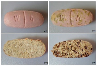 ![]() Figura 4. Comprimidos (a) recém-retirado da embalagem original e (b) após duas semanas fora da embalagem original