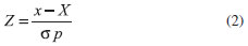 na qual x corresponde ao resultado de cada participante, X à concentraçao atribuída e σp ao desvio padrao obtido no ensaio colaborativo. Valores de Z-Scores inferiores a 2 sao considerados satisfatórios, entre 2 e 3 questionáveis e superiores a 3 insatisfatórios.