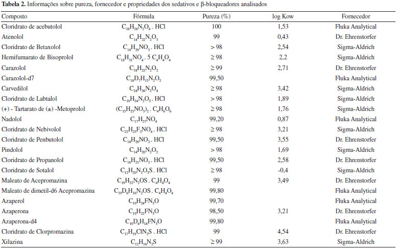 PARTE EXPERIMENTAL Reagentes e solventes Os padroes analíticos dos compostos foram adquiridos de 3 diferentes fornecedores: Dr. Ehrenstorfer GmH (Alemanha), Sigma-Aldrich (EUA) e Fluka Analytical (EUA). Além dos compostos que fazem parte do estudo, também foram utilizados 3 padroes deuterados como padroes internos (acepromazina-d6, azaperona-d4 e carazolol-d7). Os dados referentes a pureza, coeficiente de partiçao octanol-água (log Kow) e fornecedor dos padroes utilizados neste trabalho estao descritos na Tabela 2.