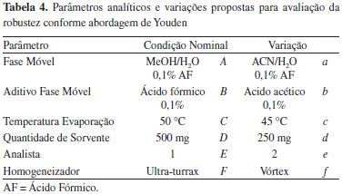 Avaliaçao dos procedimentos de extraçao Recuperaçao A avaliaçao da eficiência dos procedimentos empregados (procedimentos 1, 2 e 3) consistiu na análise das recuperaçoes obtidas para cada composto e também análise das amostras brancas obtidas, de forma a verificar presença de interferentes que prejudicariam a quantificaçao dos compostos. Para isso, foi utilizado amostras brancas fortificadas na concentraçao desejada (10 µg kg-1) antes da extraçao (denominadas A1, A2 e A3), e extratos de amostras brancas fortificadas no final do processo de extraçao (denominadas B1, B2 e B3), além da análise de amostra branca. Robustez O estudo da robustez foi realizado utilizando a abordagem de Youden, que consiste em uma análise multivariada de variáveis, as quais quando testadas nas condiçoes normais sao identificadas por letras maiúsculas e quando alteradas, por letra minúscula. O desvio padrao obtido foi utilizado para análise dos testes realizados.28 Esta abordagem foi utilizada para avaliar a variaçao produzida pelos seguintes fatores: tipo de fase móvel, aditivo utilizado na fase móvel, temperatura de evaporaçao, analista, forma de homogeneizaçao das amostras e quantidade de sorvente em amostras brancas fortificadas na concentraçao de 10 µg kg-1 utilizando procedimento selecionado para análise de sedativos e β-bloqueadores em rim suíno, conforme Tabela 4.
